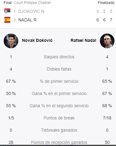 Variando alturas. Abriendo ángulos. Engañando a Djokovic cuando llegaba a sus dejadas en la red. Nadal fue un muro desde la línea de fondo. Rafa dominó mental y tácticamente a Novak sin que éste encontrara opciones. Nadal minimizó al número uno del mundo como pocas veces le han superado. Le endosó un rosco en el primero. Le metió un 6-2 en el segundo. La final terminó con 14 errores no forzados de Rafa, por los 52 de Djokovic. A continuación os dejo el resto de estadísticas: